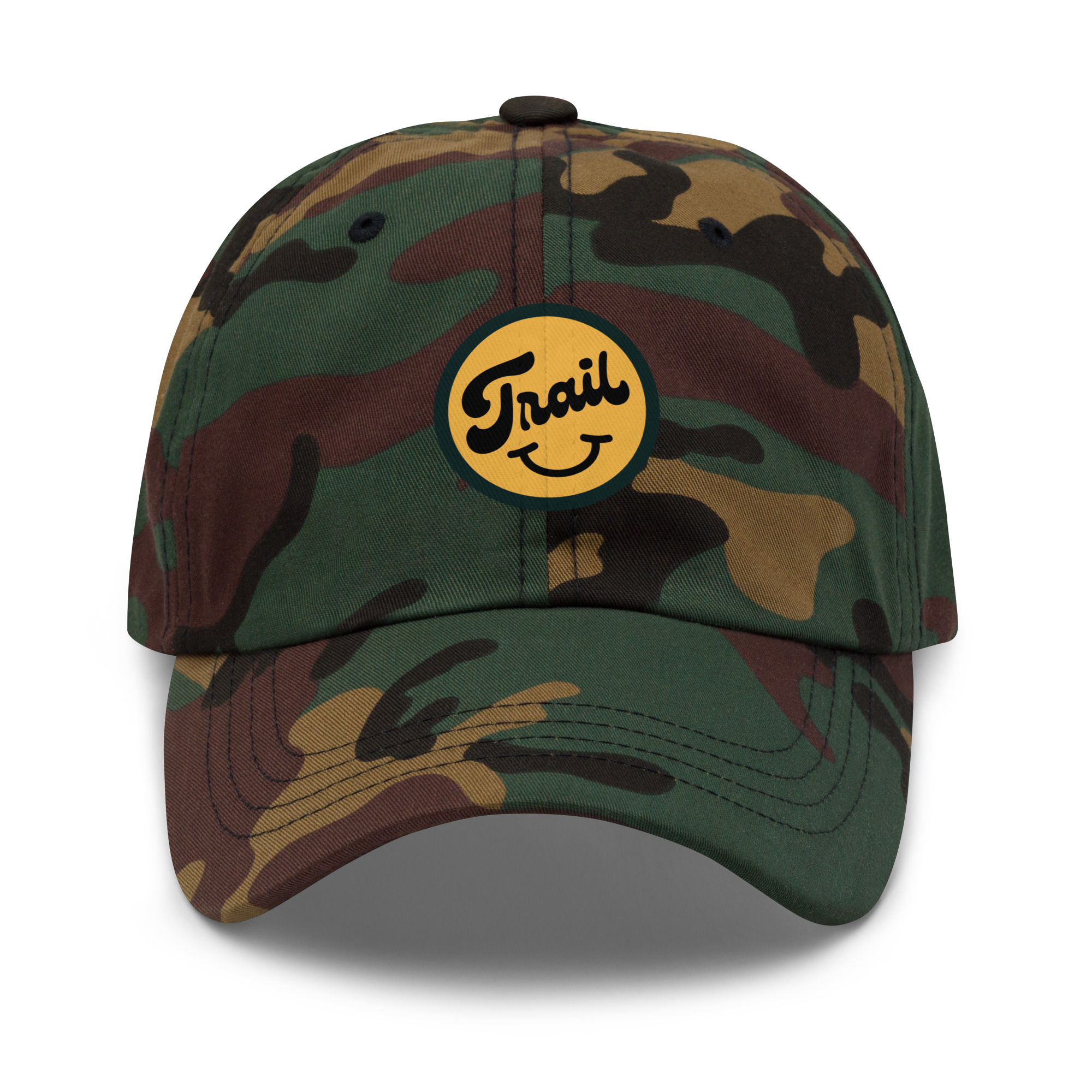 Dad hats aren’t just for dads—this cap is trendy and stylish. It has an unstructured form, a curved visor, and an adjustable buckle strap. Comfort + style = win/win!. 100% chino cotton twill. Green Camo color is 35% chino cotton twill, 65% polyester. Unstructured, 6-panel, low-profile. 6 embroidered eyelets. 3 ⅛” (7. 6 cm) crown. Adjustable strap with antique buckle. Blank product sourced from Vietnam or Bangladesh. This product is made on demand. No minimums.